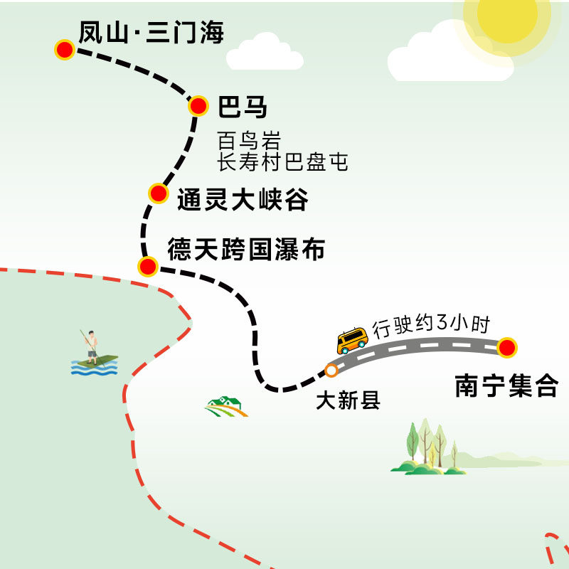 从南宁市区出发,交通便利,高铁/机场接驳顺畅。首日即可抵达崇左德天瀑布,避免冗长转车耗时。行程设计充分考虑差旅人士时间宝贵的特点,减少无效等待,最大化游玩效率。3日行程紧凑合理,适合周五下班出发、周日晚返程的周末差旅度假模式。