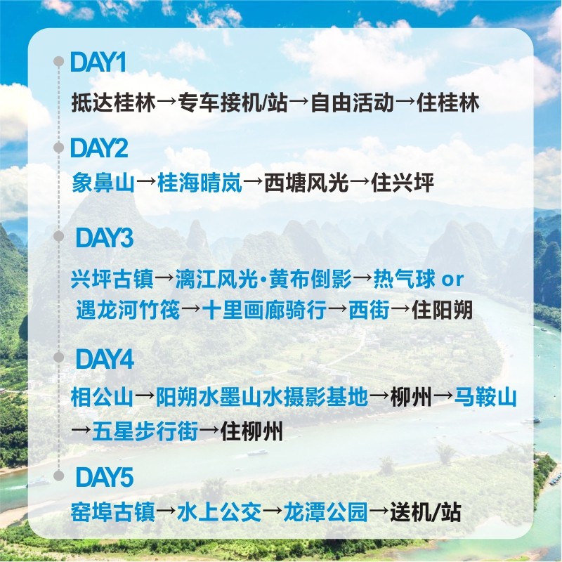 本行程支持1人独立预订,无需拼团等待,特别适合商务人士或独自出差后希望顺道放松的旅客。无论您是临时决定延长差旅假期,还是独自前往桂林处理公务,都能即刻成行,省去协调多人时间的麻烦,让差旅与度假无缝衔接,高效又自由。