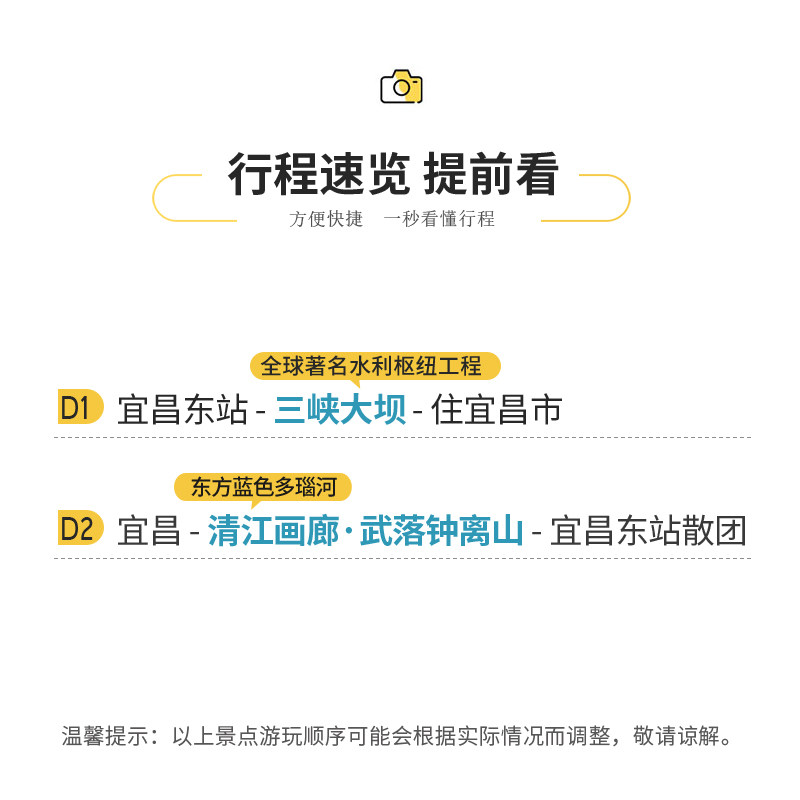 在有限的差旅间隙中,如何最大化休闲价值?本产品以两天时间浓缩宜昌最精华的自然与人文景观,价格透明、服务标准,避免隐性消费。相比自由行的规划成本与时间损耗,跟团形式更高效经济,是追求品质与效率兼得的差旅人士理想之选。
