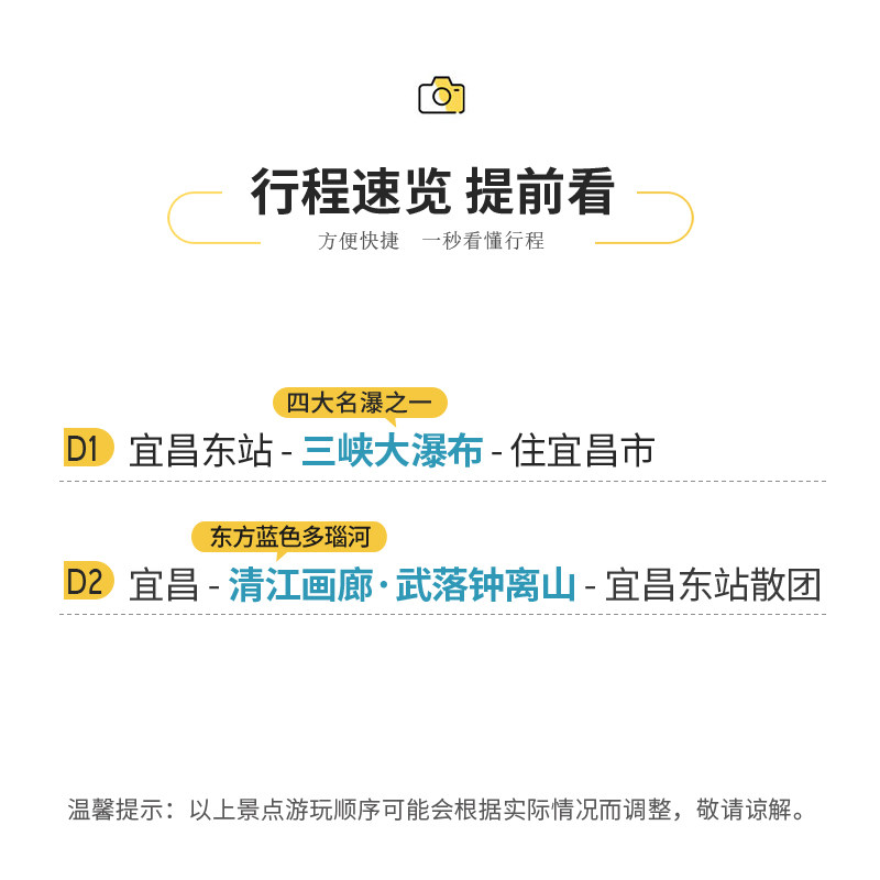 专为差旅人士设计,从宜昌本地出发,无需长途奔波,节省通勤时间与精力。行程紧凑高效,涵盖三峡大瀑布、清江画廊、武落钟离山三大核心景点,两天内完成自然奇观与文化体验的完美融合。无论是商务间隙放松身心,还是短假微度假,都能轻松实现‘说走就走’的旅行节奏,真正实现工作与休闲的无缝衔接。