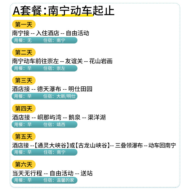 本行程支持从南宁或崇左两地灵活出发,特别适合在广西开展差旅任务的商务人士。无论您刚结束在南宁的会议,还是在崇左完成项目考察,均可无缝衔接6天5晚的深度度假之旅。无需额外中转奔波,节省宝贵时间,让差旅与休闲自然融合,实现高效出行与身心放松的双重目标。