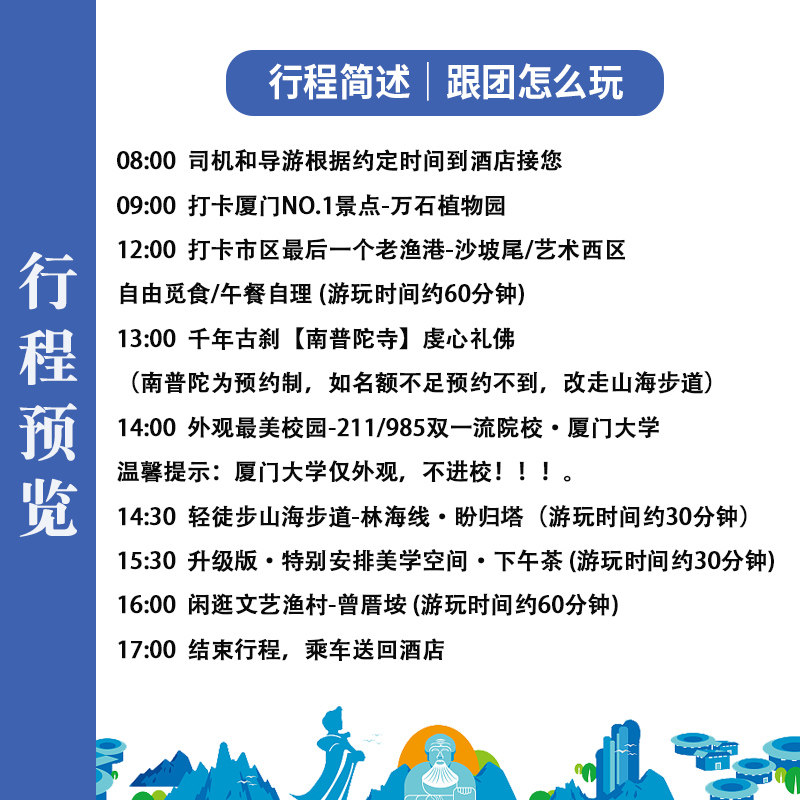 专为商务差旅人士设计,本行程支持1人独立成团,无需等待凑满人数,极大提升出行效率。无论您是独自出差还是临时决定在厦门停留一日,都能即刻预订、轻松出发。行程紧凑合理,从早8点酒店接送到晚5点送回,完美嵌入您的差旅日程,既完成工作又享受休闲,实现高效与放松的平衡。