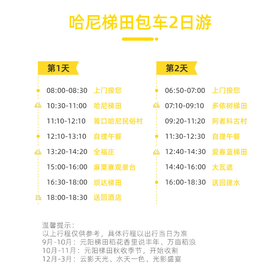本产品支持1人即可成团预订,特别适合独自出差或临时起意的商务人士。无需拼团等待,行程可完全根据您的时间安排和兴趣点自由定制,无论是清晨拍摄梯田日出,还是午后探访哈尼村落,都能灵活协调。包车服务全程待命,省去公共交通衔接烦恼,让差旅中的短暂假期高效又舒心。