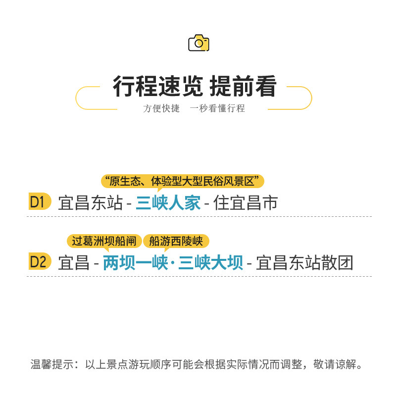 本线路巧妙融合三峡人家民俗文化、世界级水利工程(三峡大坝、葛洲坝)及峡谷自然风光,打造多维度主题游体验。差旅人士可在两天内高效完成人文探访、科技观摩与生态欣赏,满足对知识性、观赏性与放松感的多重需求,让短暂假期收获远超预期的价值。