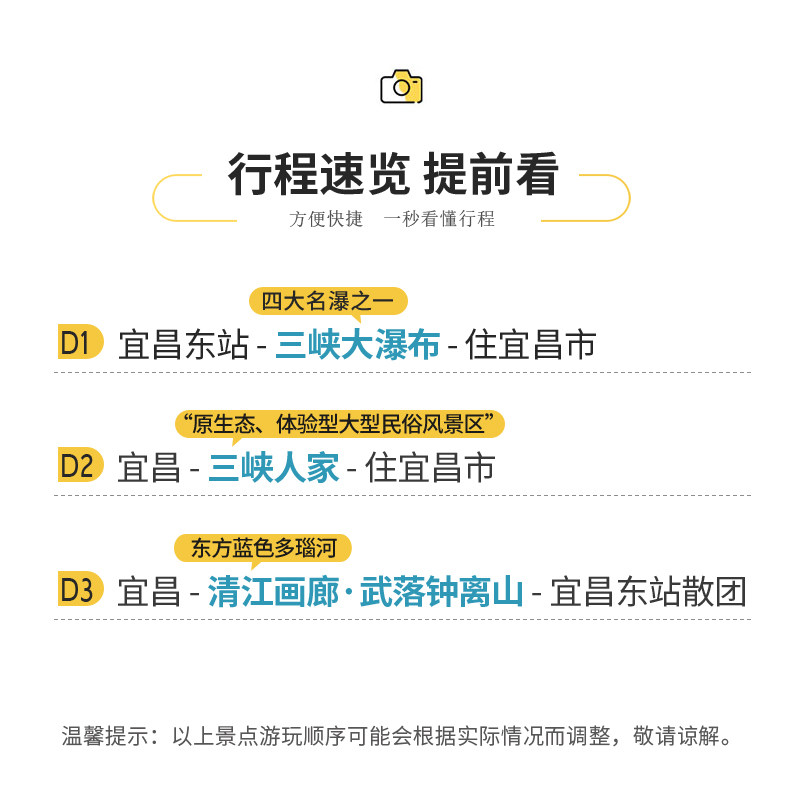 本行程以宜昌市区为起止点,紧邻宜昌东站及三峡机场,无论您是乘高铁还是飞机抵达,均可快速汇入团队,节省中转时间。特别适合利用半天或一天空档期开启短途度假,避免长途奔波消耗精力。高效衔接交通节点,让差旅中的每一分钟都物尽其用,真正实现‘说走就走’的轻度假。