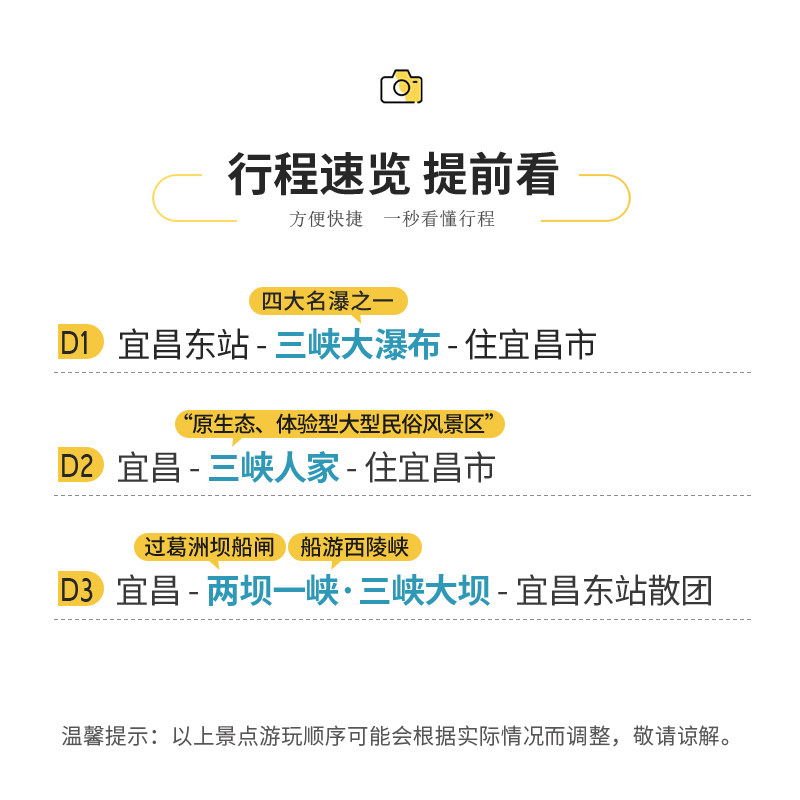 产品整合‘看瀑布、游古镇、观大坝’三大主题标签,形成逻辑连贯的体验动线。差旅人士无需自行规划路线,3日内高效打卡宜昌最具代表性的自然与人文地标。主题化串联避免走马观花,确保每个场景都成为难忘记忆点,提升差旅附加值。
