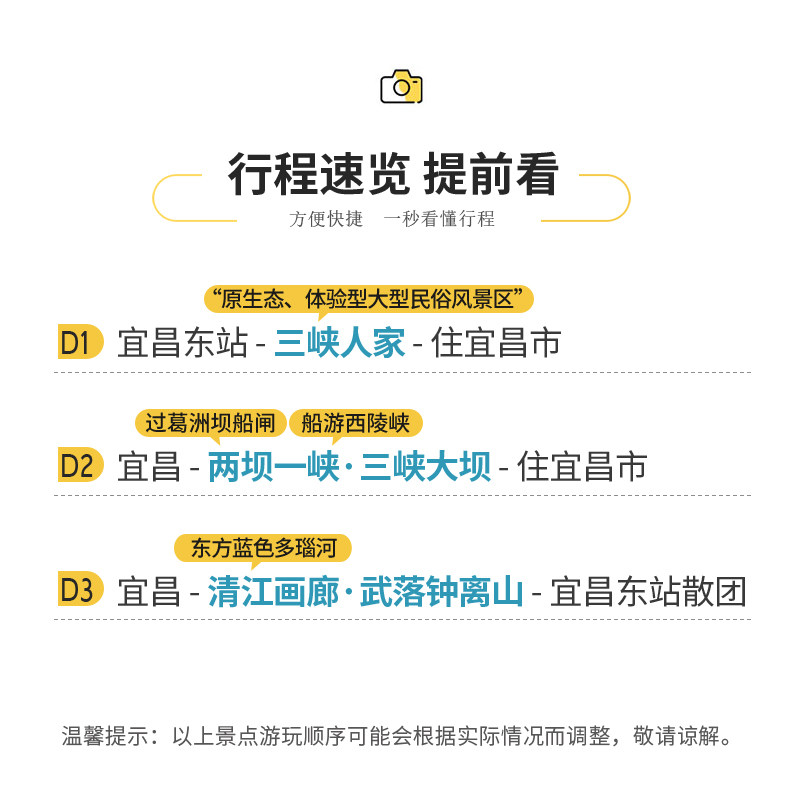 三天行程集齐宜昌最具代表性的旅游IP——三峡大坝、清江画廊、三峡人家、葛洲坝,形成完整的“两坝一峡+古镇山水”主题闭环。对于首次到访或仅有短暂停留的差旅者,无需自行规划路线,即可高效打卡所有标志性景点,确保差旅假期不虚此行,满载而归。