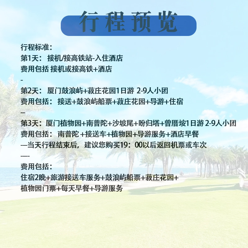 本行程支持1人单独预订,无需拼团等待,特别适合商务差旅人士在完成工作后即刻开启短途度假。厦门三日游安排紧凑合理,首日抵达即可入住酒店休整,次日深度游览鼓浪屿及菽庄花园,第三天打卡植物园、南普陀等文化地标,傍晚还可享受海上明珠塔下午茶,轻松衔接返程交通。小团模式兼顾私密性与服务品质,是高效差旅与休闲度假的理想结合。