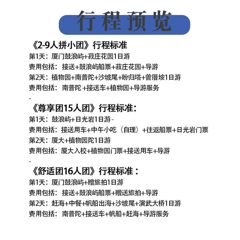 本行程支持单人预订,无需拼团等待,特别适合商务人士在差旅间隙灵活安排短途度假。无论是临时调休还是会议结束后的放松时光,只需一人下单即可享受完整的鼓浪屿与厦门市区精华游,省去协调多人时间的繁琐,真正实现说走就走的高效差旅休闲体验。