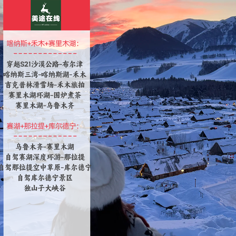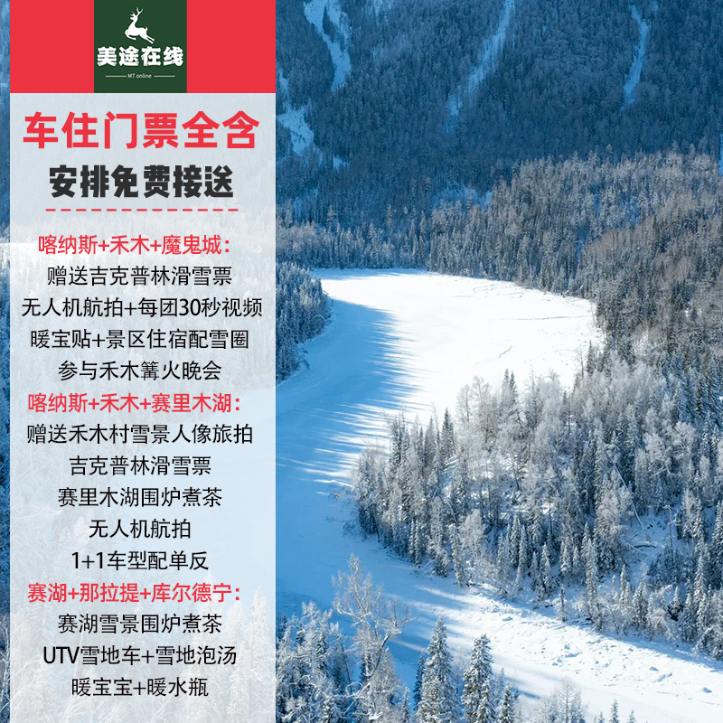 专为商务差旅或独自出行旅客设计,本线路支持1人报名即可成团,无需拼凑多人,极大提升行程灵活性。无论您是结束乌鲁木齐的公务后想就近度假,还是专程前来体验北疆雪境,都能无缝衔接7天6晚的高品质小团行程。从阿勒泰到伊犁,覆盖吉克普林滑雪场、禾木古村、赛里木湖等核心景点,全程专业领队陪同,省去交通与住宿安排烦恼,让差旅后的放松真正高效又惬意。
