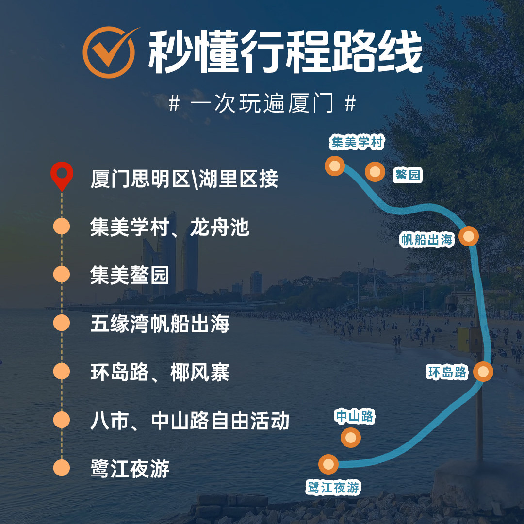 专为差旅人士设计,本线路将厦门精华景点如集美学村、椰风寨、环岛路与中山路巧妙串联,行程紧凑却不仓促。上午参观文化地标,下午体验帆船出海,傍晚鹭江夜游收尾,全程仅需一天,无需额外请假,即可在繁忙公务之余享受海岛风情,实现工作与休闲的无缝切换。