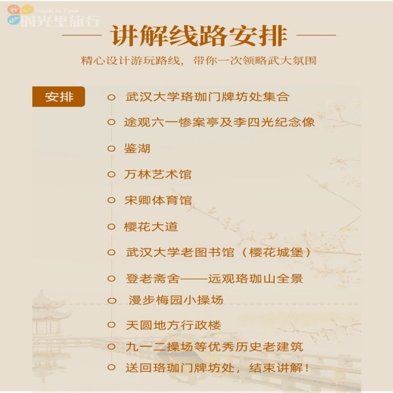 即使目的地是熟悉的武汉,本产品也能带您发现不一样的城市侧面。通过武汉大学这一文化地标,深入感受江城的学术气质与历史厚度。相比常规景点打卡,这种聚焦单一IP的深度微度假模式,更适合差旅人士在有限时间内获得独特而难忘的城市记忆,让每一次出差都多一分期待。