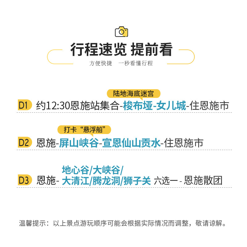 差旅计划常有变动?本产品支持1人独立成团预订,无需等待拼团或协调多人时间,特别适合临时外派、项目考察或短期出差的商务人士。只要确定日期,即可一键启程,在恩施的山水间快速切换状态,高效完成公务后即刻投入放松之旅。