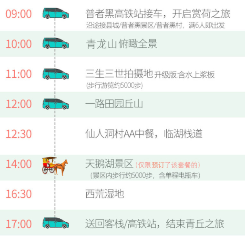 专为差旅人士设计,从云南文山市区出发,无需长途奔波即可直达普者黑景区。行程紧凑高效,涵盖青龙山登高、仙人洞村探访、西荒湿地漫游等核心体验,特别适合商务间隙或会议前后安排半日或一日休闲。单程电瓶车接驳省时省力,最大化利用碎片化时间,让差旅与度假无缝融合。