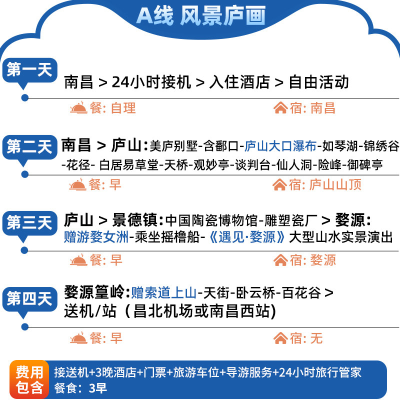 本行程支持1人单独报名参团,特别适合因公出差后顺道度假的商务人士。无需凑团等待,随时出发,高效利用差旅间隙。4天3晚的紧凑安排兼顾工作与休闲,既可探访婺源古村、庐山胜景,又能沉浸于望仙谷的山水实景演出,让差旅不再只是奔波,而是身心双重充电的优质体验。