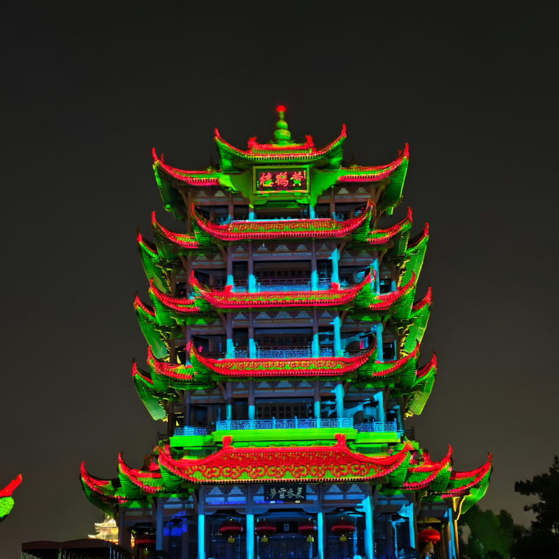 夜幕下的黄鹤楼,灯光璀璨,景色迷人。游客可以登楼赏月,俯瞰长江灯光