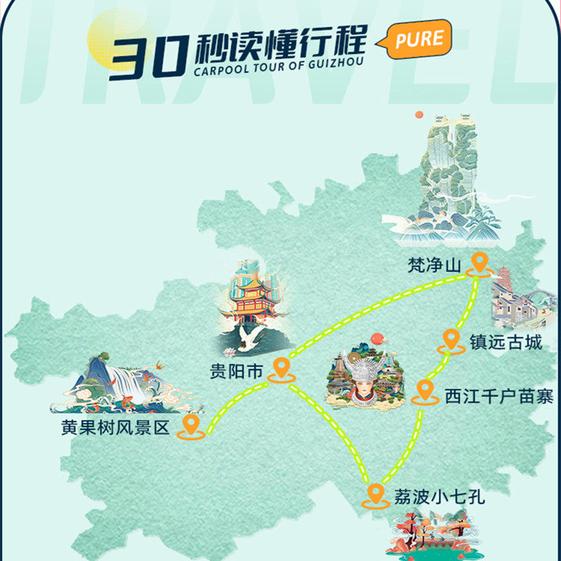 本行程专为差旅人士设计,从贵阳便捷出发,4天内高效覆盖黄果树瀑布、梵净山、荔波小七孔、西江千户苗寨及镇远古镇五大核心景区。路线规划科学,减少无效交通耗时,适合利用周末或短假期完成一次深度度假。独立成团模式保障私密性与灵活性,无论是商务出差顺带放松,还是双人结伴出游,都能在紧凑日程中享受高品质山水人文体验。