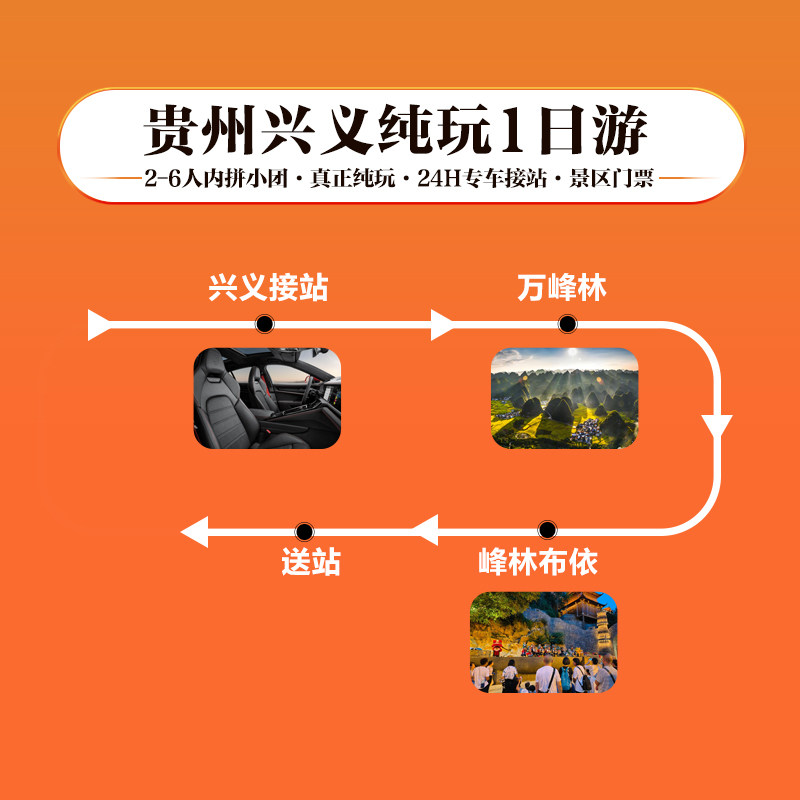 本线路支持1人单独预订,无需拼团等待,特别适合因公出差或临时起意的商务人士。黔西南兴义作为贵州重要城市,交通便利,可在完成工作后无缝衔接一日游行程,轻松实现“工作+休闲”两不误。小团模式确保服务品质,节省沟通成本,是高效差旅人士的理想选择。
