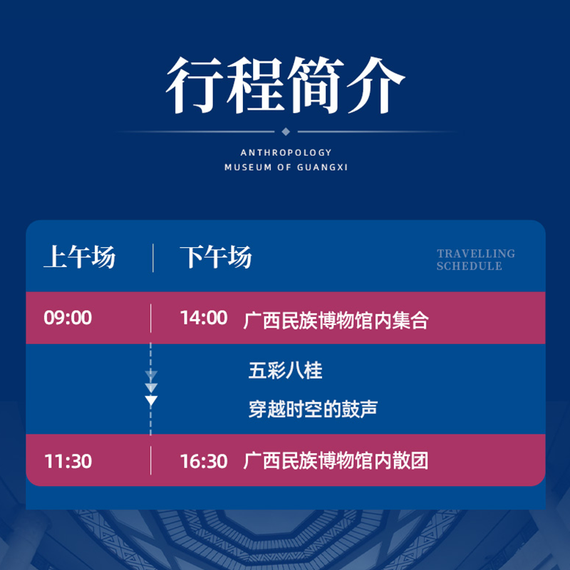 在繁忙差旅中注入人文滋养,本产品以“民族记忆与非遗传承”为主题,通过专家精讲串联展品背后的故事。从铜鼓文化到织锦技艺,从干栏建筑到节庆习俗,2.5小时内系统梳理广西民族文化发展脉络。不仅是一次参观,更是一场思想与审美的深度对话,助您在商务之余提升文化感知力。