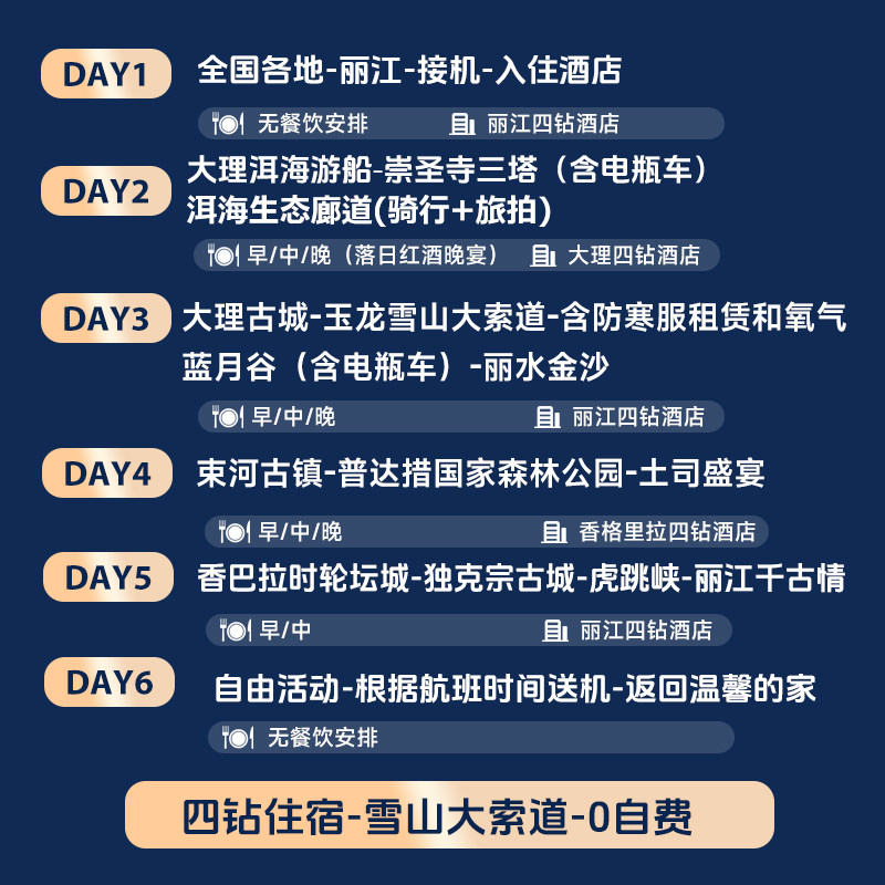 差旅报销讲究透明合规,本行程明确承诺‘0自费’,所有景点门票、演出、餐食、交通均包含在内,无隐形消费。费用结构清晰,便于企业差旅管理或个人预算控制。同时涵盖玉龙雪山大索道、洱海游船、香格里拉高原适应安排等高价值项目,性价比远超同类产品,让差旅度假既体面又经济。