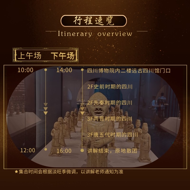 区别于普通观光,本产品聚焦“历史文化游”与“人文旅行”主题,围绕四川博物院核心展品展开系统性解读。出差途中不再只是酒店与会议室两点一线,而是通过一场有主题、有深度的文化行走,留下独特而富有内涵的城市记忆,让差旅更具人文温度。
