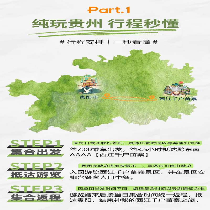 本行程专为差旅人士设计,从贵阳市区便捷出发,全程交通安排妥当,无需中转折腾,节省宝贵时间。无论是商务出差间隙的短途放松,还是会议结束后的文化体验,一日游行程紧凑高效,当天往返不耽误次日工作。专业导游随行讲解,让您在有限时间内深度了解苗族文化与建筑特色,实现工作与休闲的完美平衡。
