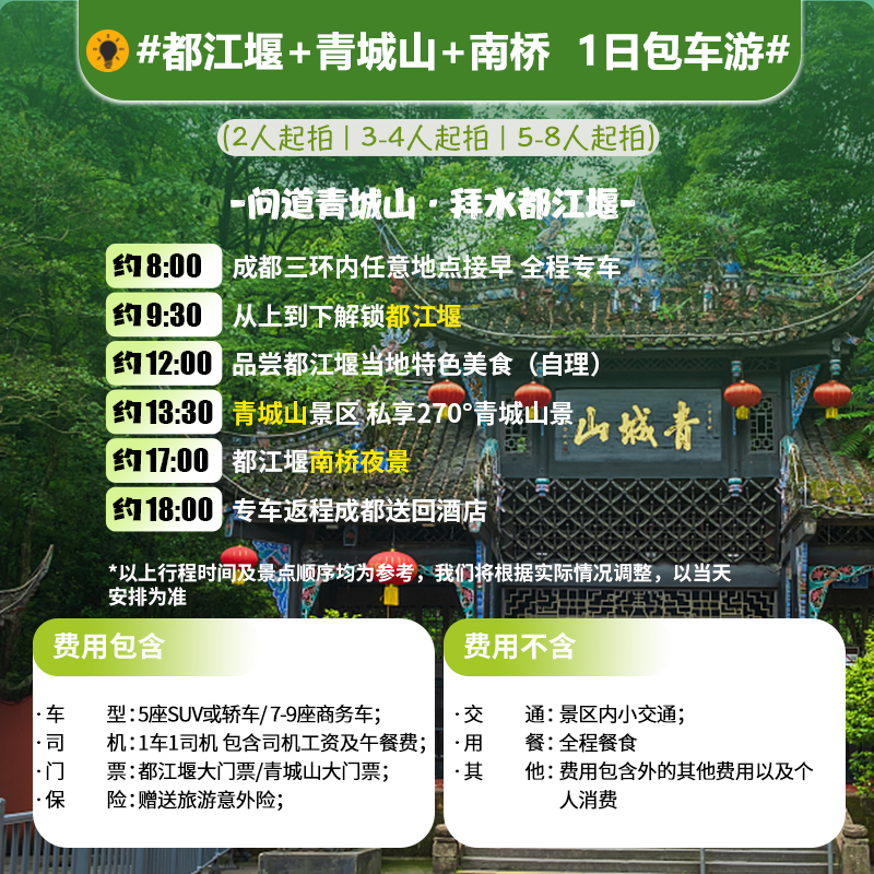 行程特别融入‘南桥夜游’与‘古村古镇’元素,在白天密集文化参访后,傍晚可漫步都江堰南桥,欣赏蓝眼泪般的夜景灯光,或探访周边川西林盘古镇,感受慢节奏生活。这种昼夜结合的设计,让一日行程张弛有度,即使短暂停留也能收获丰富感官体验。