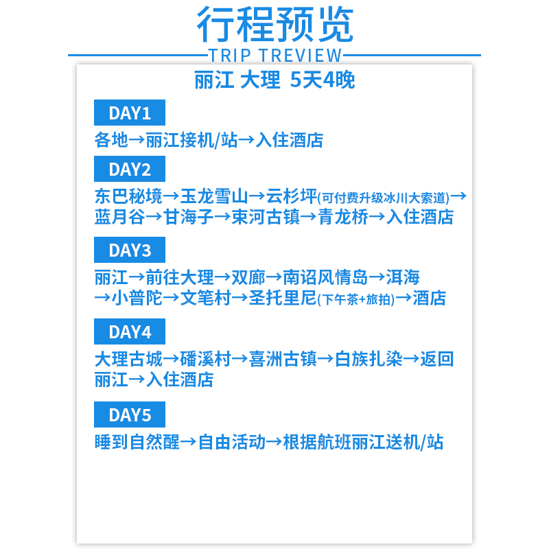 本行程专为兼顾差旅与度假需求的旅客设计,采用5天4晚私家团模式,全程包车自由行,无需拼团等待,极大提升时间利用效率。无论是从丽江出发探索周边,还是往返大理处理临时公务,专属司机与导游可按您的节奏灵活调整路线,确保商务会议与景点游览无缝衔接,真正实现“出差也能深度游”。