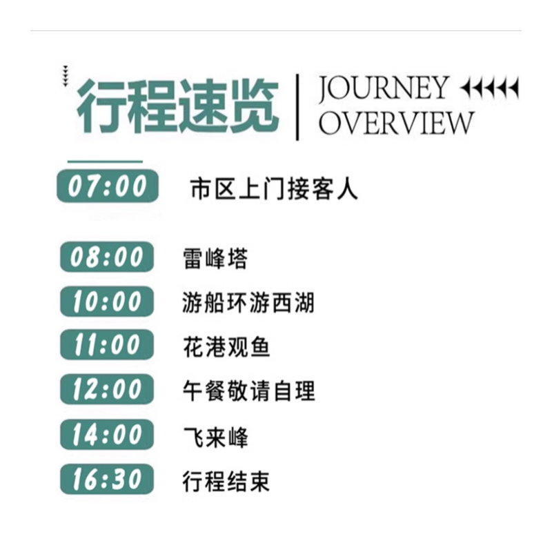出差行程常有变动?本产品支持1人单独预订,无需拼团或等待成团,极大提升差旅安排的灵活性。无论您是独自出差、临时延长停留,还是想利用周末快速游览杭州精华景点,均可随时下单、即时确认。特别适合时间紧张、行程不确定的商务旅客,在高效完成工作之余,也能沉浸式感受西湖山水与千年古刹的文化魅力。