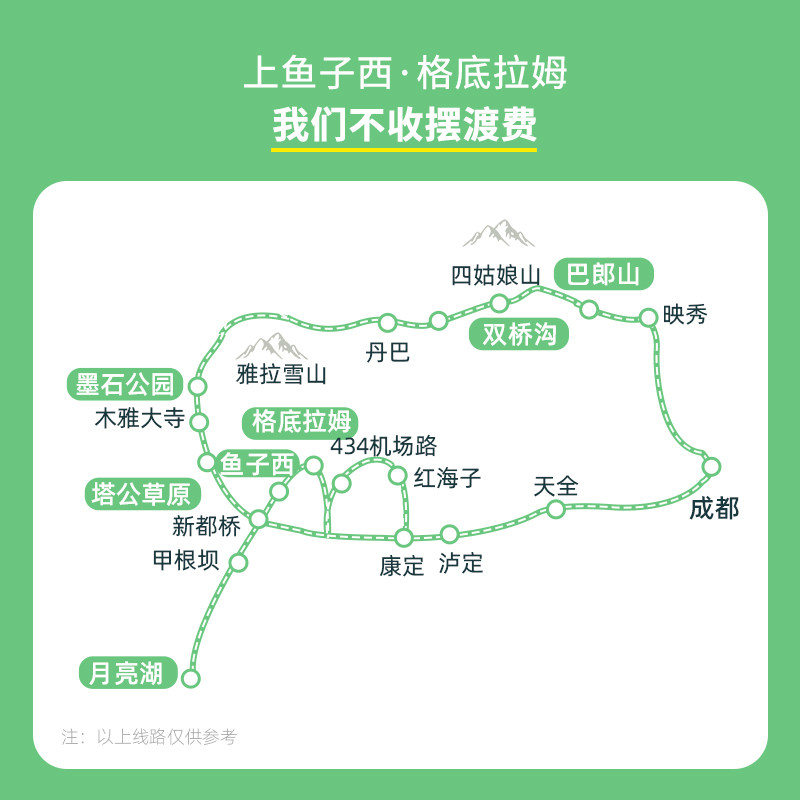 本线路支持1人单独报名参团,无需拼凑人数,特别适合商务人士或独自出差后顺道度假的旅客。从成都出发前往川西甘孜、阿坝地区,行程安排紧凑合理,4天3晚即可深度体验四姑娘山、月亮湖、鱼子西、墨石公园等核心景点,兼顾差旅效率与休闲放松,让短暂假期也能收获满满。
