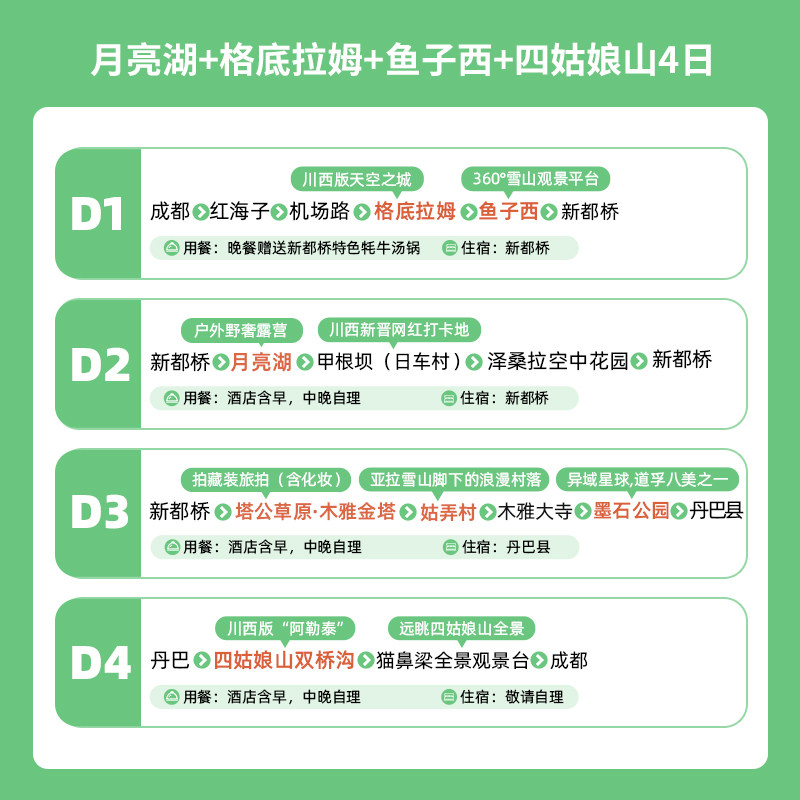 线路从成都(四川核心交通枢纽)出发,高铁、航班密集,无论您是结束本地会议还是转机中转,均可无缝接入本行程。4天3晚的设计充分考虑差旅时间窗口,周五出发周日返程即可完成,最大化利用周末或调休时间,实现工作与度假的高效协同。