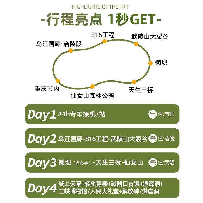 本行程专为差旅人士及独自出行者设计,支持1人单独报名参团,无需等待拼团或担心人数不足取消。对于临时出差后想顺道度假的商务旅客而言,极大提升了行程安排的灵活性与确定性。无论您是结束重庆市区会议后的短途放松,还是专程前来探索武隆奇观,都能即订即走,省去协调多人时间的繁琐,真正实现“说走就走”的高效差旅度假体验。