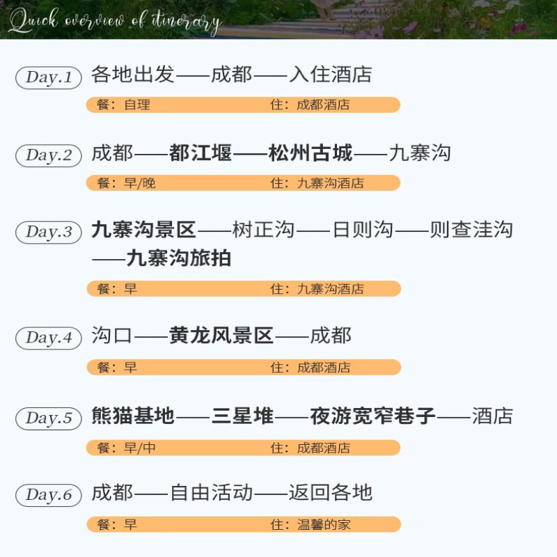 专为高强度工作的差旅族优化行程节奏,6天时间科学覆盖九寨沟、黄龙、都江堰、三星堆、熊猫基地等核心景点,避免走马观花。每日安排张弛有度,住宿优选舒适酒店,确保体力恢复,让短暂休假真正起到放松身心、充电续航的作用,而非增加疲惫感。
