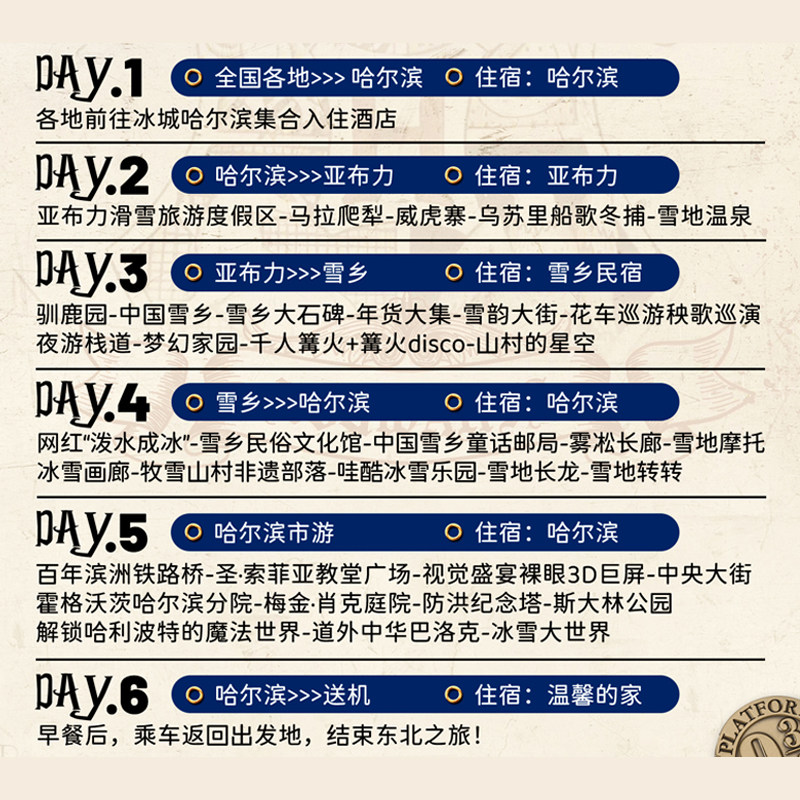 针对频繁往返北上广深等一线城市的商务人群,本产品提供紧凑而充实的6天5晚行程。白天可利用高铁或航班快速抵达哈尔滨,随后投入ATV越野体验、冰雪大世界夜游等特色活动。全程无购物环节,杜绝无效停留,确保差旅效率与休闲体验并重。