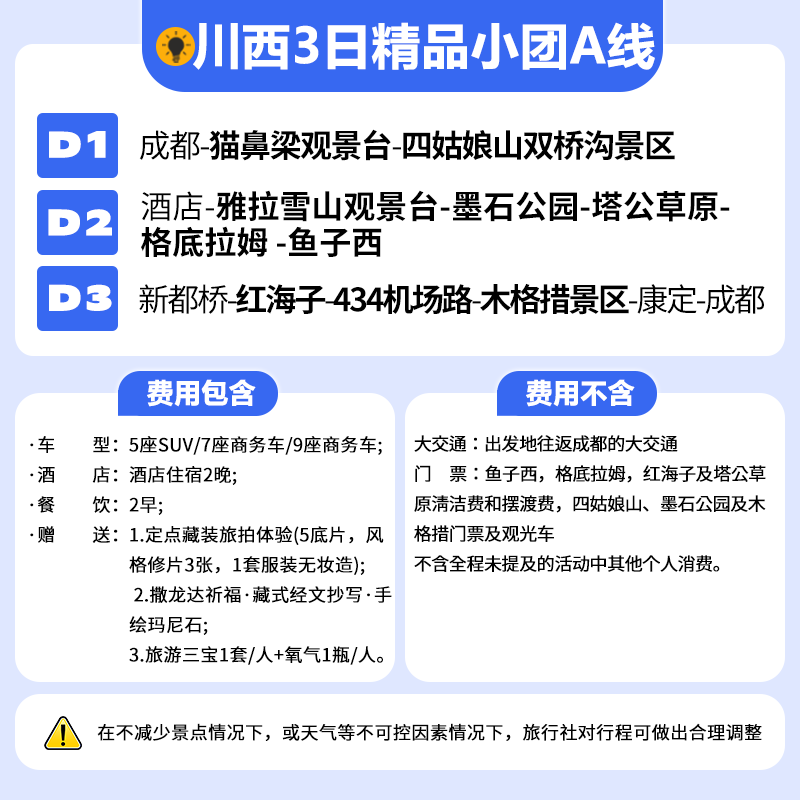 本线路支持1人独立成团,特别适合商务人士或独自出差后想顺道放松的旅客。无需等待他人拼团,行程安排更自由,时间掌控更高效。从成都出发前往甘孜,3日2晚紧凑又充实,既满足差旅间隙的短途度假需求,又能深度体验川西高原的自然与人文魅力,是高效差旅与休闲度假的理想结合。