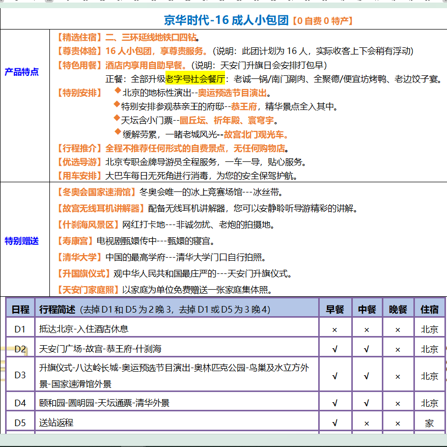 厦门、福州、宁波等东南沿海城市商务活跃,往返北京需求旺盛。本产品为海派差旅客定制融合南北文化的5日行程:清晨看升旗,白天登长城,傍晚逛南锣鼓巷,夜宿四钻酒店。全程无购物、无隐形消费,真正实现从滨海都市到皇城根下的无缝切换,提升差旅幸福感。