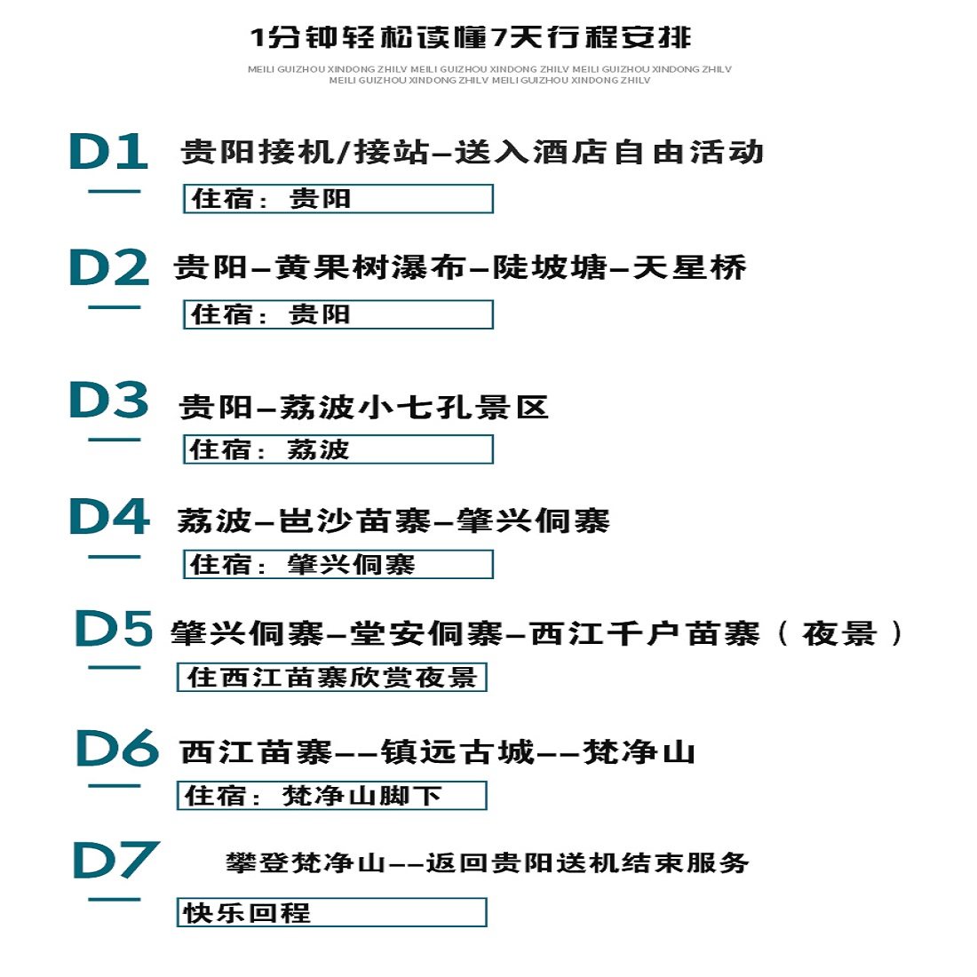 本行程专为从贵阳出发的差旅人士设计,7天6晚紧凑而充实,高效串联黄果树瀑布、小七孔、肇兴侗寨、千户苗寨及梵净山等贵州核心目的地。全程交通接驳顺畅,减少中转耗时,让您在有限假期中深度体验黔东南的自然奇观与民族文化,兼顾效率与放松,是商务出行之余的理想度假选择。