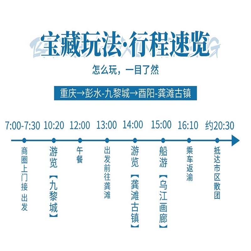 专为时间紧凑的商务旅客设计,一日之内高效游览蚩尤九黎城、龚滩古镇与乌江画廊三大标志性景点。无需多日请假,即可深度体验巴渝文化精髓。从苗族始祖文化到千年吊脚楼古建,再到千里乌江壮丽山水,行程紧凑却不失深度,完美契合差旅人士对效率与体验的双重需求。