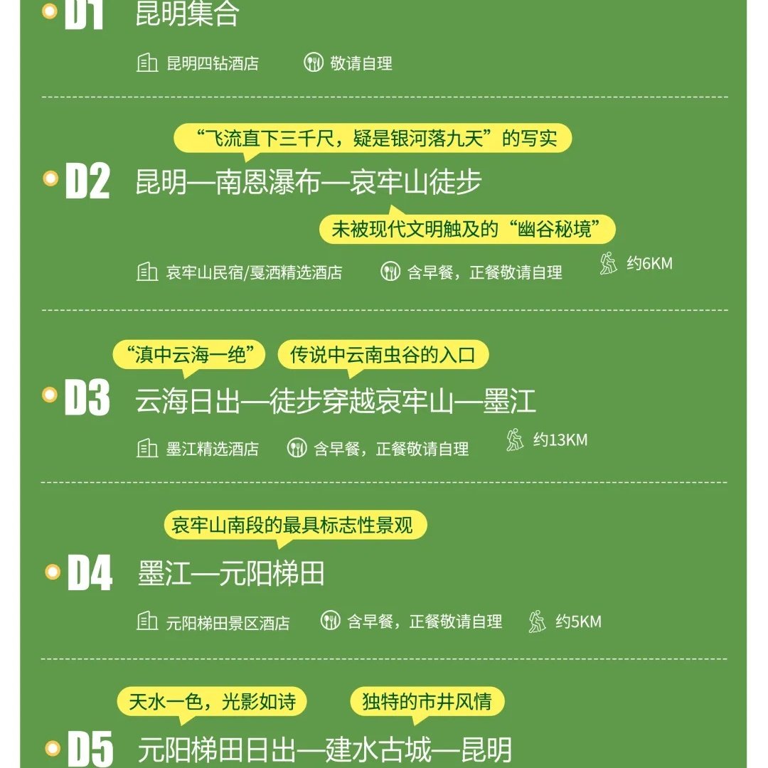 本行程支持单人预订,特别适合出差途中顺道放松或独自出行的商务人士。无需等待拼团,随时出发,节省时间成本。昆明作为西南交通枢纽,航班与高铁网络发达,便于全国差旅人士快速抵达。行程设计兼顾效率与体验,白天可处理公务,傍晚即投入自然怀抱,实现工作与休闲的无缝切换,真正体现现代差旅新理念。