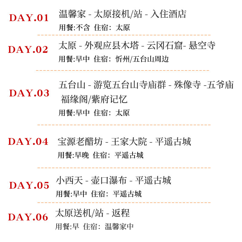 福建厦门、福州出发的差旅用户,可便捷接入山西文化深度游。行程不仅展现云冈石窟的北魏艺术、五台山的佛教氛围,更通过晋中古村镇揭示晋商辉煌历史。产品强调“1人可订”灵活性,适合闽南地区频繁出差的外贸、电商从业者利用周末+年假组合,高效完成一次兼具历史厚度与休闲品质的主题旅行,实现差旅价值最大化。
