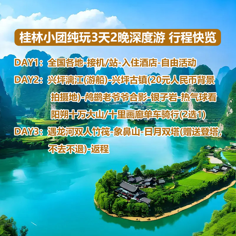 本行程专为差旅人士设计,采用8人小团模式,确保行程高效、服务贴心。小团出行避免了大型团队的冗长等待,适合时间紧凑的商务旅客在完成工作后快速切换至度假模式。桂林三日游涵盖漓江、阳朔、兴坪等核心景点,既能领略喀斯特地貌的自然奇观,又可在遇龙河竹筏上放松身心,实现工作与休闲的完美平衡。