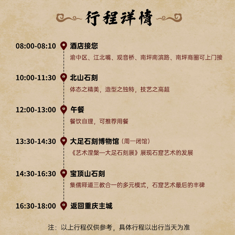 专为忙碌的差旅人群量身打造,本行程采用高效一日游模式,清晨从重庆市区出发,傍晚即可返回,全程约8-10小时,完全适配工作日或周末碎片时间。无需额外请假,不打乱原有差旅计划,即可轻松打卡世界文化遗产,实现‘工作度假两不误’的理想状态。