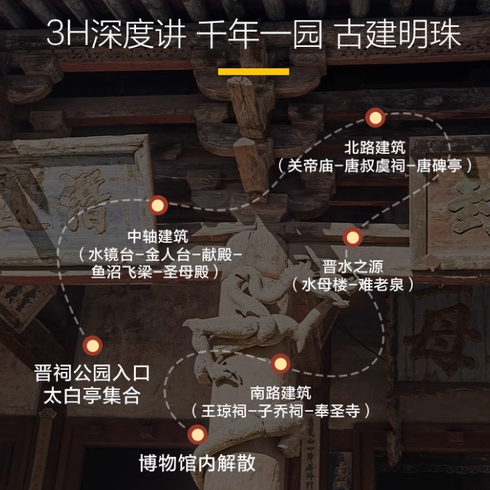 区别于走马观花式游览,本产品以“逛博物馆”为核心,聚焦晋祠博物馆内文物与历史脉络,通过专业讲解将碎片信息串联成生动故事。适合差旅人士利用午休或傍晚时段,用2-3小时完成一次有深度的文化体验,既不占用整日时间,又能有效缓解工作压力,提升旅行质感。