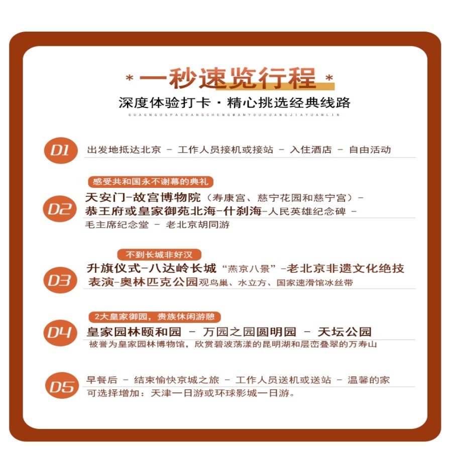 无论您从大连的港口、鄂尔多斯的能源基地,还是嘉峪关的丝路古城出发,本产品均提供标准化的北京差旅度假服务。一价全包模式消除各地报价差异,确保全国客户同质体验。行程聚焦‘历史古建+天然氧吧+特色美食’三大标签,让您在高效完成公务之余,登长城、品烤鸭、逛胡同,用5天时间深度感知首都脉搏,提升差旅附加值。
