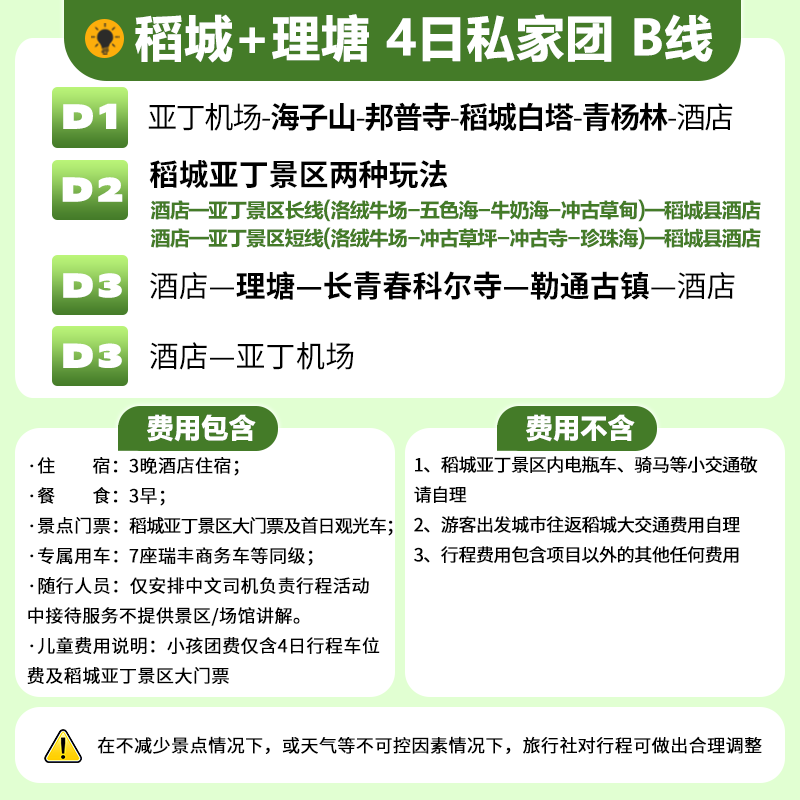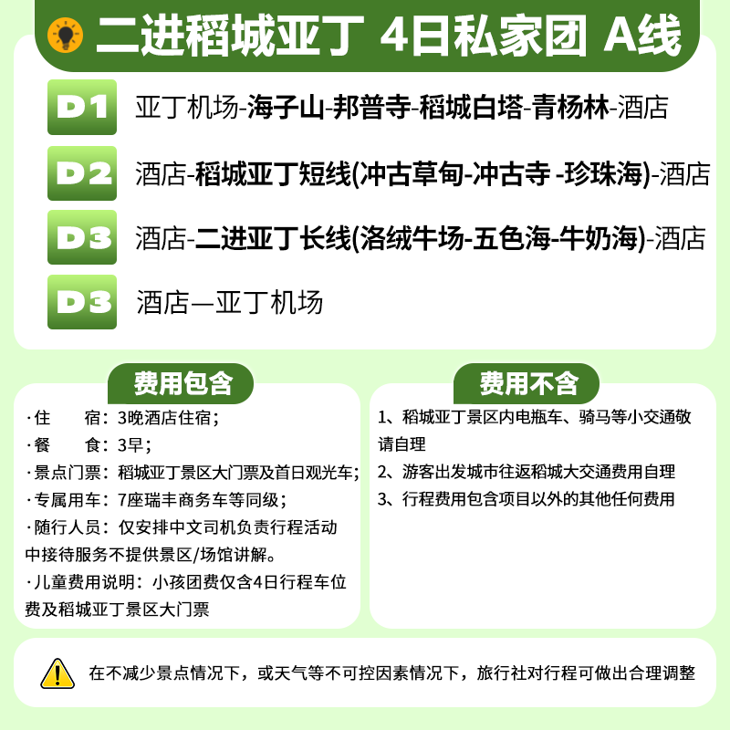 全程私家团配置,配备专属司机与导游,行程节奏由您掌控,避免大团游的拥挤与被动。对于注重效率与体验的差旅人群,私密空间和个性化服务能有效缓解工作压力,在稻城亚丁的纯净山水中获得身心双重疗愈,是高端差旅休闲的理想选择。