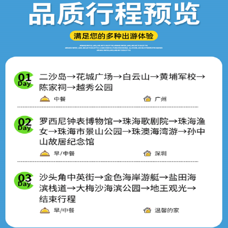 广州、深圳、珠海三地高铁网络发达,车程均在1-2小时以内。本行程充分利用区域交通优势,优化路线衔接,减少无效等待与转乘时间。对时间宝贵的差旅人士而言,这意味着更多可用于工作或休息的有效时间。同时,专业导游全程协调交通与门票,免除您自行规划的繁琐,让高效出行成为可能。