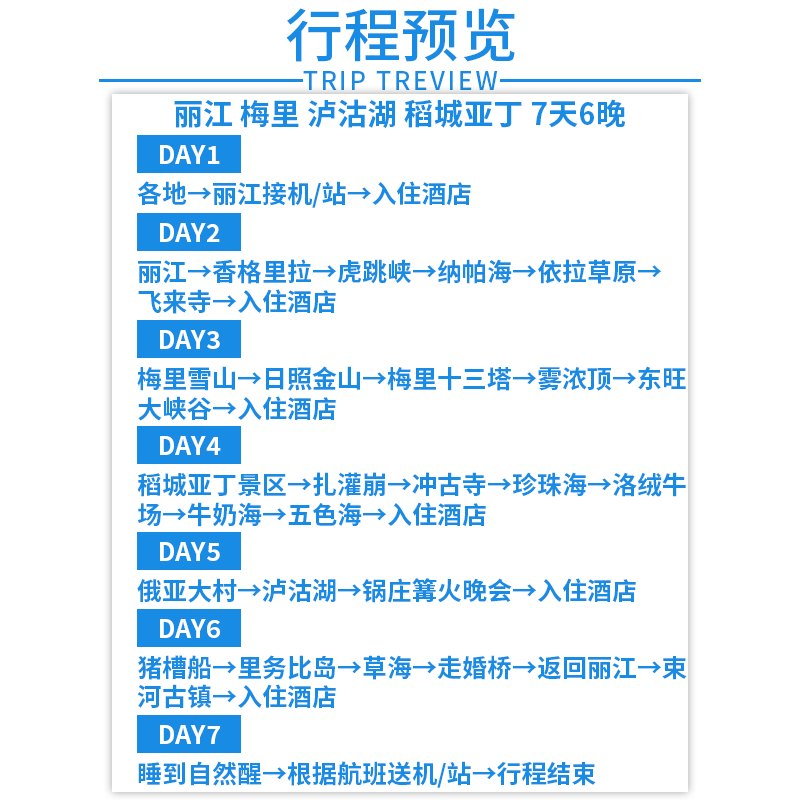 本行程以丽江为起点,巧妙串联云南迪庆(香格里拉、梅里雪山)与四川甘孜(稻城亚丁)两大高原目的地,特别适合商务人士在差旅间隙安排深度度假。全程7天6晚包车私家团,灵活调整出发时间,避免公共交通耗时,高效利用碎片假期。沿途涵盖泸沽湖、古村古镇、寺庙等多元文化景观,满足您对自然与人文的双重期待,让差旅不再只是奔波,更是一场身心放松的旅程。