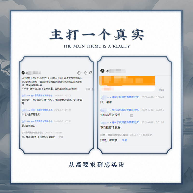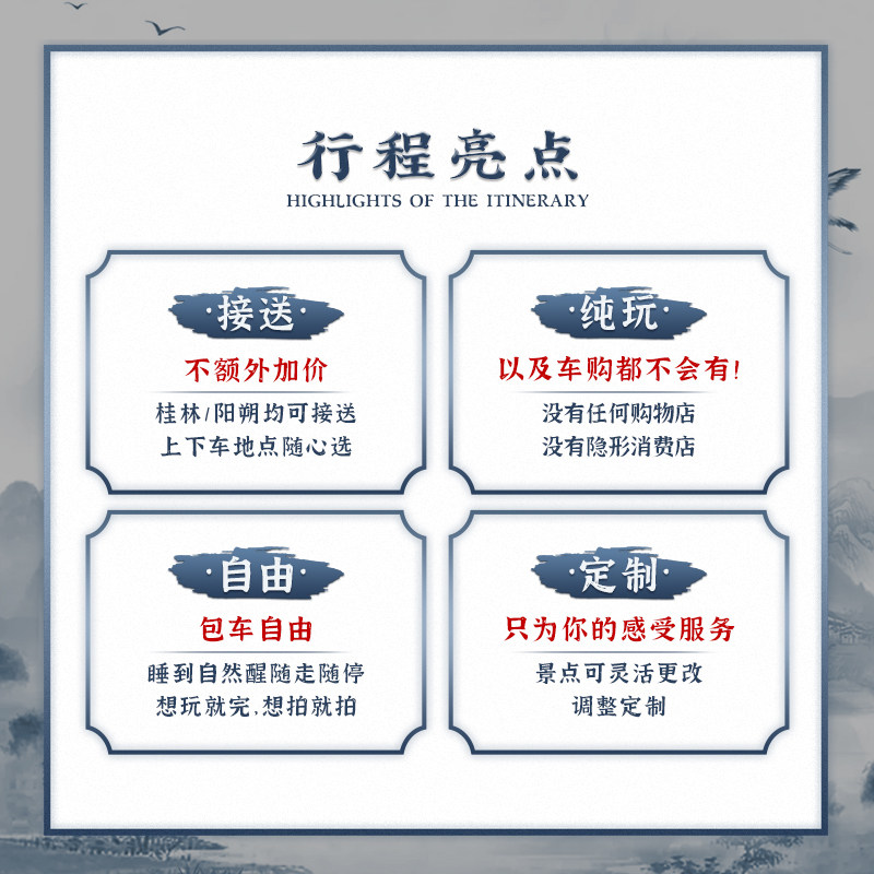 针对差旅人群对隐私和效率的双重需求,产品提供包车及私家小团选项。专属车辆随叫随到,避免公共交通耗时;专业司机兼向导熟悉路线,节省沟通成本。无论是独自出差后的放松,还是携同事共游,都能在私密空间中享受漓江山水,让差旅不再只是奔波,更是一场精致微度假。