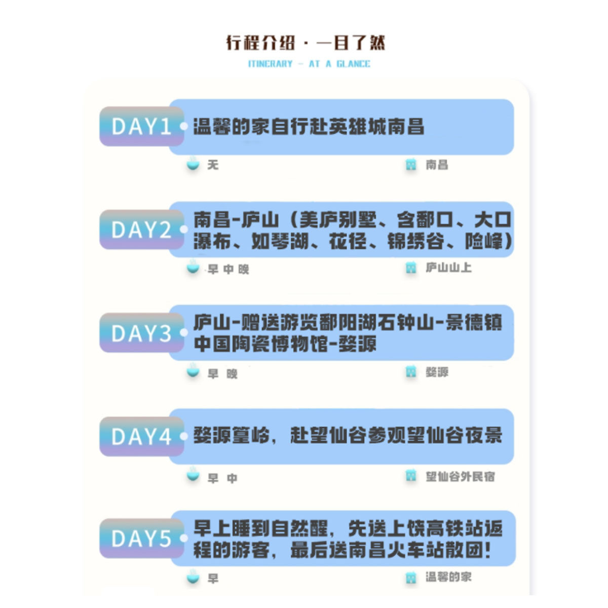 全程聚焦江西省内南昌、九江、上饶、景德镇四大城市,避免跨省交通带来的手续繁琐与时间损耗。对于华东、华中地区的差旅人群而言,省内短途移动更为便捷,高铁与高速网络发达,车程均控制在合理范围内。这种区域深耕式设计,既保证了景观多样性,又极大简化了行程规划难度,特别适合希望就近度假又不愿舟车劳顿的商务旅客。