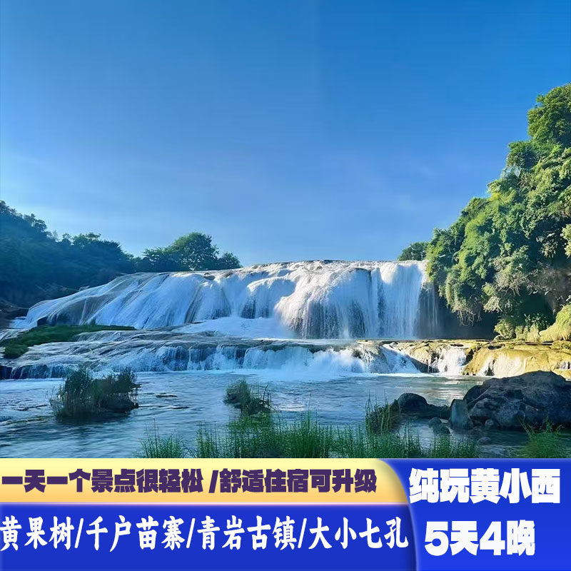本行程支持从北京、上海、广州、深圳、成都、重庆等全国26个主要城市便捷出发,无论您是结束一场紧张的商务会议,还是刚完成区域巡检,均可无缝衔接5天4晚的贵州深度度假。交通网络发达,航班与高铁班次密集,节省中转时间,让差旅人士在有限假期中最大化享受黄果树瀑布、西江千户苗寨与荔波小七孔的自然人文之美,实现工作与休憩的完美平衡。